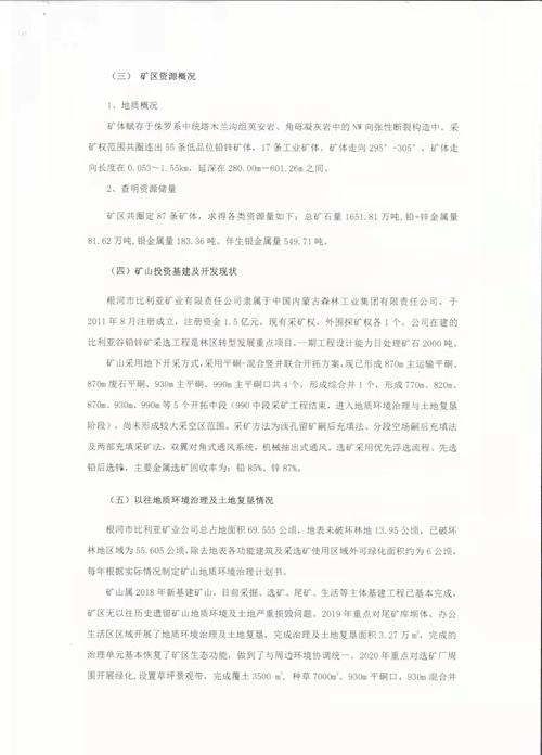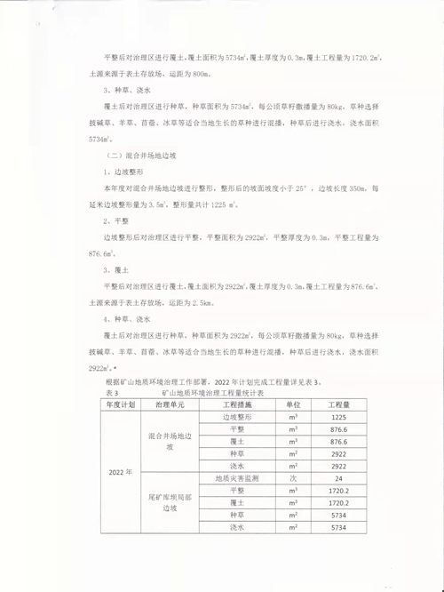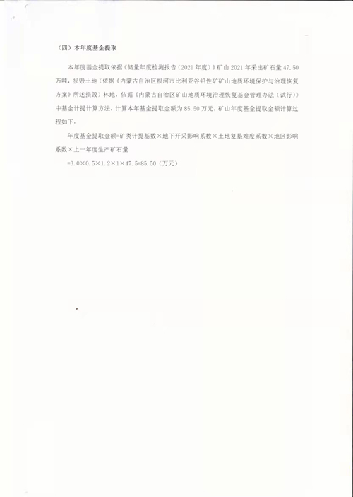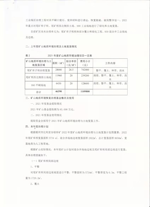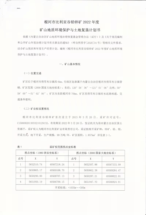 依据《内蒙古自治区矿山地质环境治理恢复基金管理办法(试行)》及《关于规范编制和公开矿山年度治理计划书有关事宜的通知》(呼自然资字[2020]34号)等相关文件要求,结合矿山现状和年度生产经营计划,编制《根河市比利亚谷铅锌矿2022年度矿山地质环境治理保护与土地复垦计划书》并在企业门户网站上进行公示,公示信息如下: