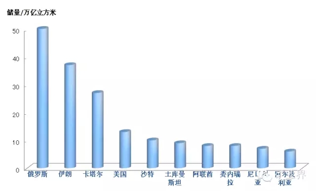 俄罗斯、伊朗和卡塔尔是世界三大资源国,证实储量分别占世界总量的24.0%、17.0%和12.6%,世界天然气剩余探明储量排名前10位的国家如下。