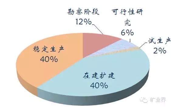 随着世界铁矿石需求不断增长,世界铁矿勘查在沉寂多年后出现新高潮,探明一批大型的铁矿。目前全球约525座生产、在建、扩建和处于勘查阶段的铁矿山,铁矿资源共有1377亿t,铁矿勘查进展程度占比情况如下:
