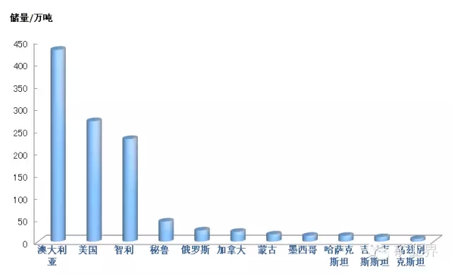 世界铜储量约7亿t,铜储量广泛分布在世界各地,其中储量较多的国家是智利、澳大利亚和秘鲁,三国合计约占世界铜储量的50%,其他储量较多的国家有美国、墨西哥、印度尼西亚、中国、俄罗斯、波兰、赞比亚、加拿大和哈萨克斯坦等。