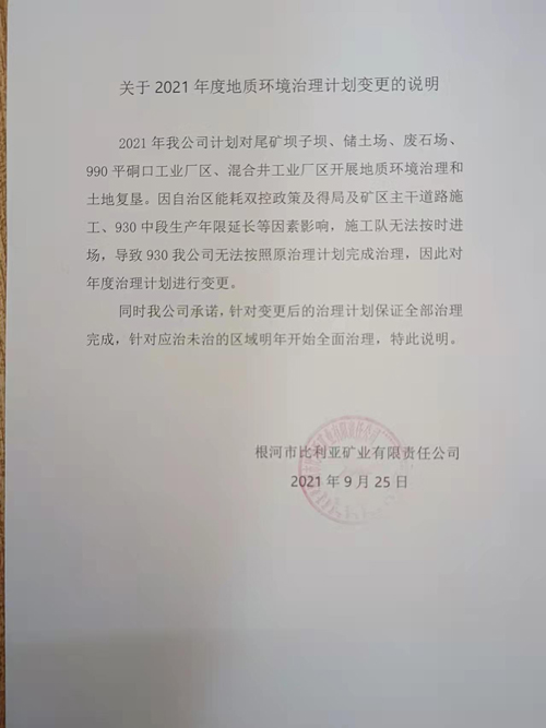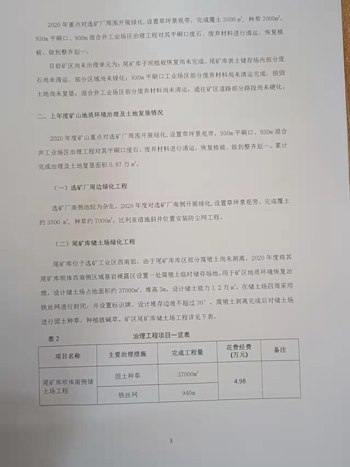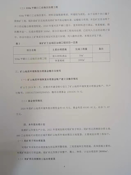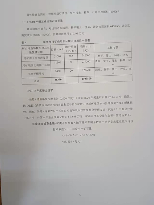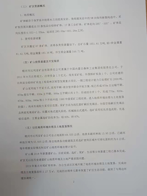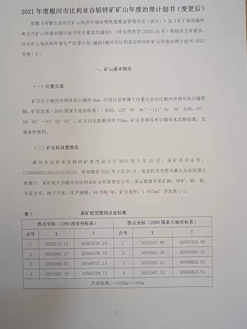 依据《内蒙古自治区矿山地质环境治理恢复基金管理办法(试行)》及《关于规范编制和公开矿山年度治理计划书有关事宜的通知》(呼自然资字[2020]34号)等相关文件要求,结合矿山现状和年度生产经营计划,编制《根河市比利亚谷铅锌矿矿山年度治理计划书(2021年度)》并在企业门户网站上进行公示,公示信息如下: