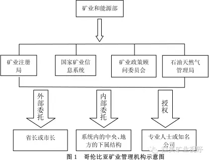 矿业和能源部下设矿业注册局、 国家矿业信息系统、 矿业政策顾问委员会及石油天然气管理局(ANH)等,并具体委托(内部及外部)或授权于地方的省长或市长、系统内的中央、专业人士或知名公司等具体进行操作管理,如图 1。