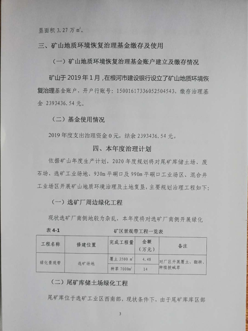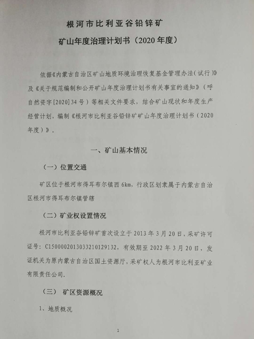 按照《内蒙古自治区矿山地质环境治理恢复基金管理办法(试行)》要求,现将根河市比利亚矿业有限责任公司《2020年地质环境治理计划书》进行公示。计划书内容如下: